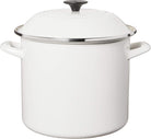 Tall straight sides and large capacity make enamel on steel Stockpots ideal for soups, stocks, cooking pasta and boiling seafood. Available in a range of convenient sizes, they deliver our fastest-heating performance of premium carbon steel glazed in our beautiful palette of colors. Lightweight and durable, carbon steel rapidly brings water to a boil to speed up prep and cooking and retains heat to keep food and liquids warm. The easy to clean colorful porcelain enamel coating is non-reactive and resistant to stains and flavors, making enamel on steel stockpots ideal for everyday use.