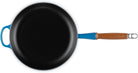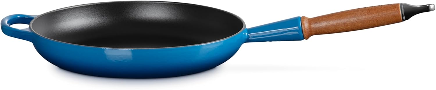 A vintage Le Creuset design refreshed for modern kitchens, the enameled cast iron Alpine Wood Handle Fry Pan is a versatile pan for everything from searing and sautéing, to pan frying, stovetop casseroles and more. Sloped sides make it easy to stir sauces and flip crepes, while exceptional heat distribution and retention ensures food is cooked to perfection. The black satin enamel interior eliminates the need for the traditional seasoning and maintenance of raw cast iron – the enamel develops a natural patina over time making it virtually non-stick and easy to clean. The pan is finished with a durable wood handle that is designed to stay cool and comfortable while cooking, yet elegantly handsome for stove to table serving.
