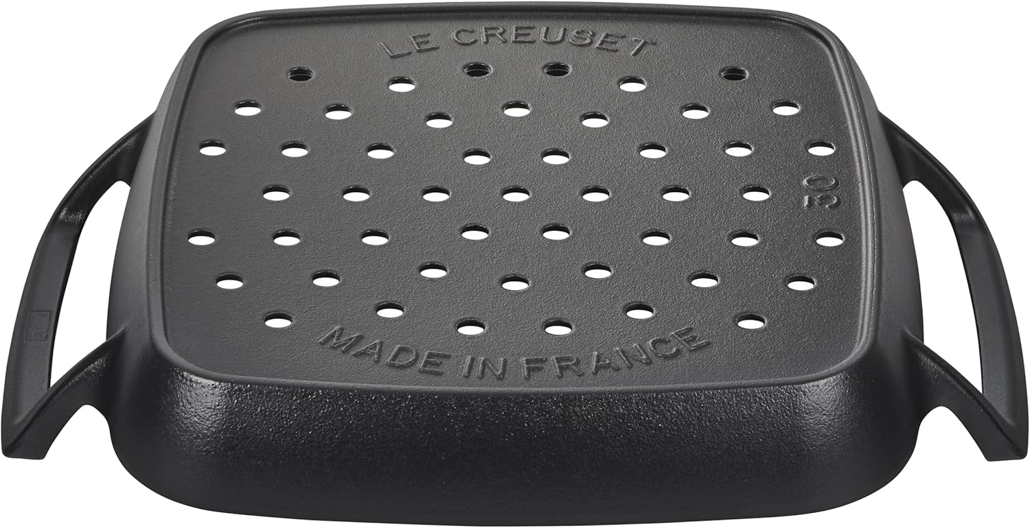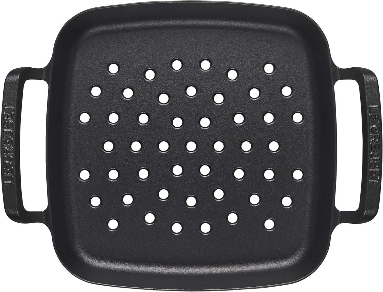 Go beyond the kitchen with the Alpine Outdoor Square Grill Basket – it’s ideal for sautéing, stir-frying and roasting outdoors. Crafted from enameled cast iron and specifically designed for cooking over an open flame, the grill basket is completely encased in a rugged matte black enamel that is ready to use and requires no seasoning. Perforations in the bottom of the basket keep small items from falling through, while still allowing heat to reach the food for smoky chargrilled flavor. It’s perfectly sized to fit on most grills with enough room to grill alongside with a wide surface area for even cooking. The raised loop handles make it easy to maneuver on the grates, yet with a low-profile design that allows grill hoods to close. Durable and easy to clean, the Alpine Outdoor Square Grill Basket is ideal for fish and shellfish, asparagus and other small vegetables, French fries and more.