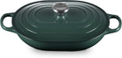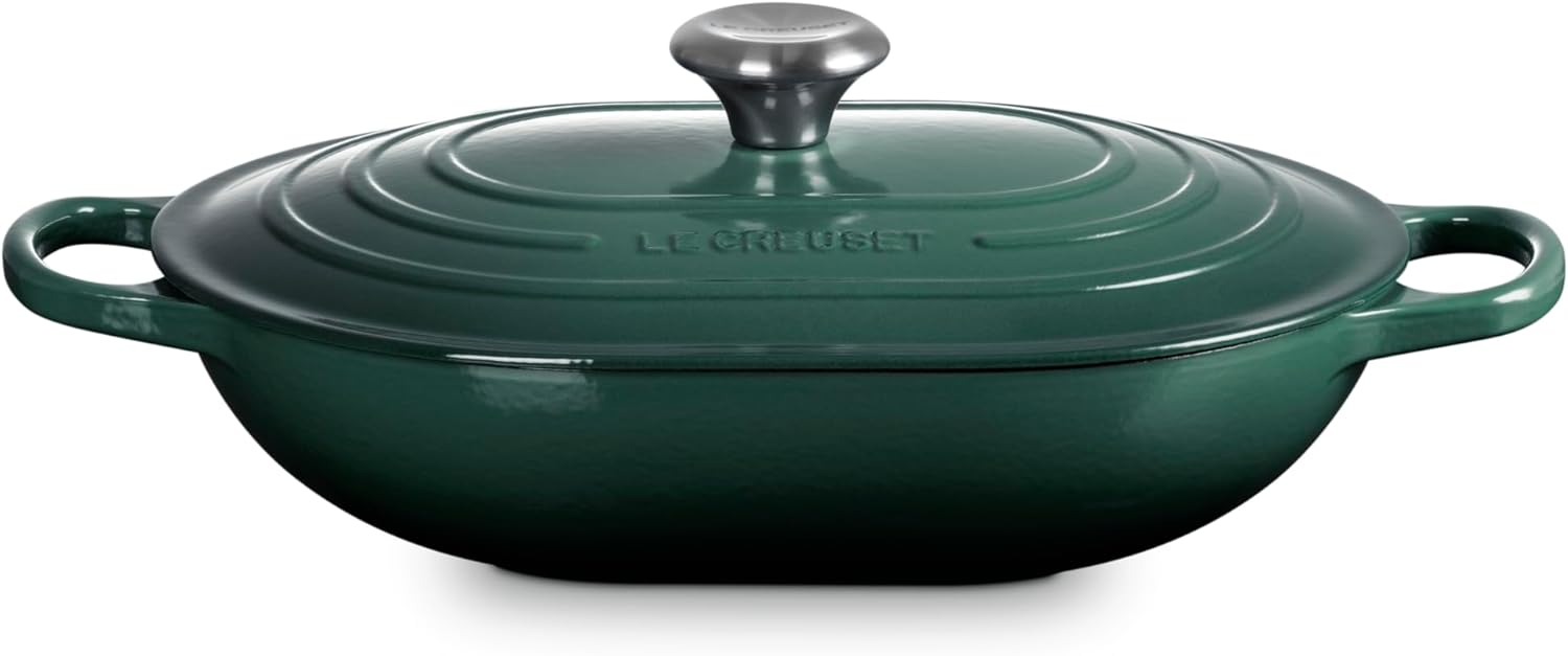 Perfect for sautéing, shallow frying, steaming and serving dishes straight to the table, the enameled cast iron Signature Oval Casserole can handle everything from roasts and whole fish to vegetables and side dishes. The elongated oval shape is ideal for larger cuts of meat, hearty stews and baked casseroles meant to share. The sloped sides and wide cooking surface make stirring and serving a breeze. Use it with the lid as a traditional casserole for family meals, or without as a roaster or buffet dish when entertaining guests.