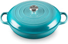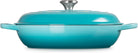 The Le Creuset enameled cast iron Braiser is uniquely designed to provide steady, even heat to transform tough cuts of meat and hearty vegetables into tender, flavorful dishes. The wide base allows ingredients to be placed in a single layer for searing without crowding; once liquid is added, the domed lid circulates steam to lock in moisture and flavor. The versatile shape of the braiser also makes it perfect for shallow frying, steaming, stews, casseroles and serving at the table.