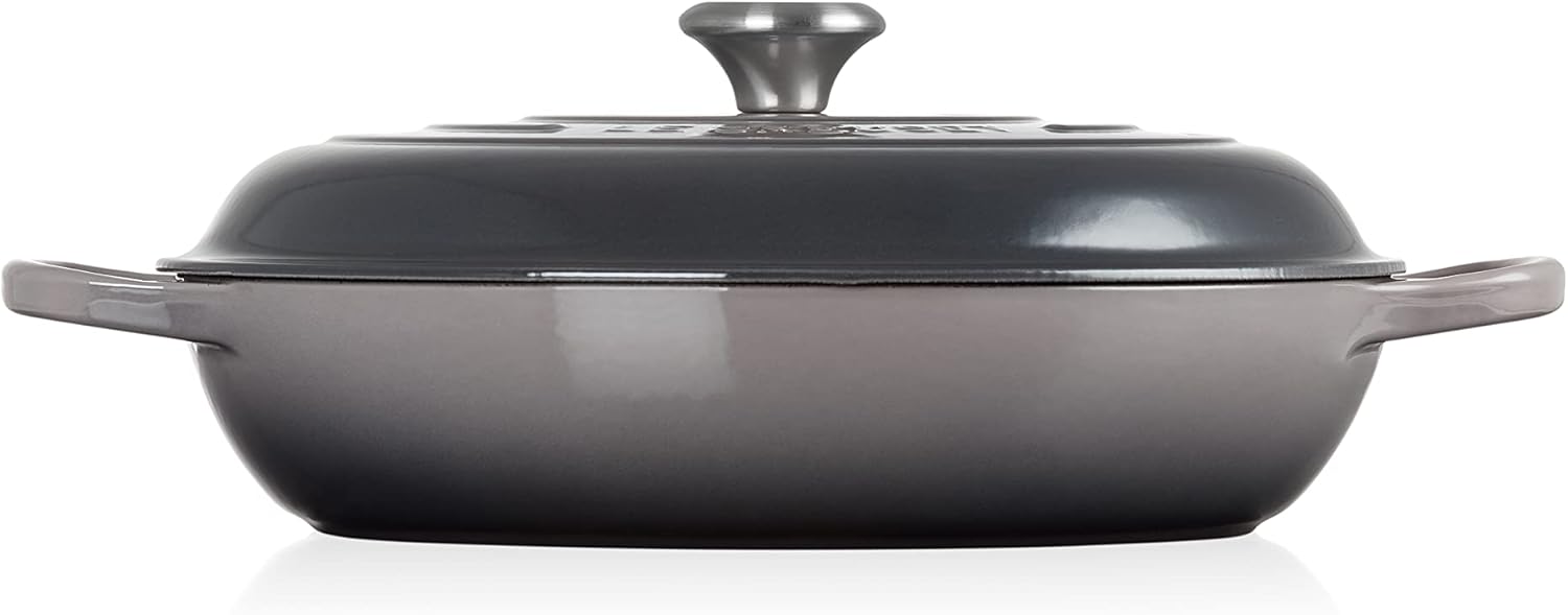 The Le Creuset enameled cast iron Braiser is uniquely designed to provide steady, even heat to transform tough cuts of meat and hearty vegetables into tender, flavorful dishes. The wide base allows ingredients to be placed in a single layer for searing without crowding; once liquid is added, the domed lid circulates steam to lock in moisture and flavor. The versatile shape of the braiser also makes it perfect for shallow frying, steaming, stews, casseroles and serving at the table.