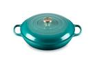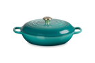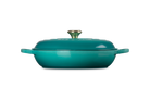 The Le Creuset enameled cast iron Braiser is uniquely designed to provide steady, even heat to transform tough cuts of meat and hearty vegetables into tender, flavorful dishes. The wide base allows ingredients to be placed in a single layer for searing without crowding; once liquid is added, the domed lid circulates steam to lock in moisture and flavor. The versatile shape of the braiser also makes it perfect for shallow frying, steaming, stews, casseroles and serving at the table.