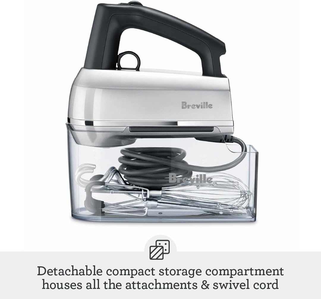 A detachable storage compartment houses all the attachments and swivel cord so you’ll love this mixer even when it’s turned off.