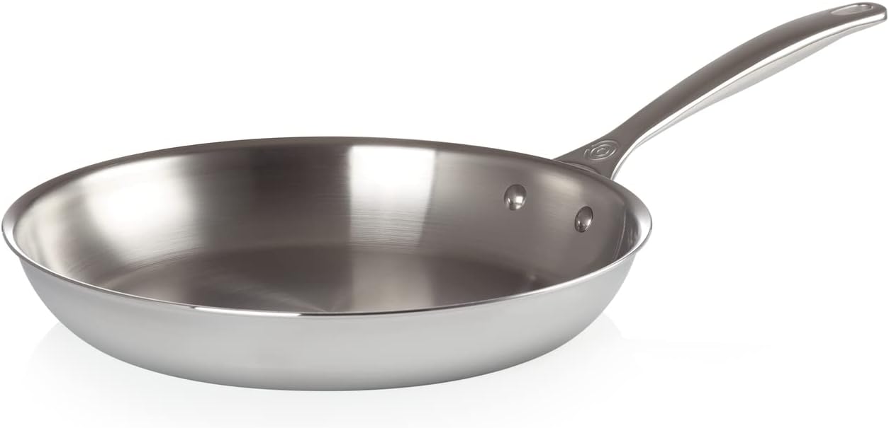 Le Creuset Signature Stainless Steel Fry Pans are a kitchen staple for everything from searing meats to sauteing vegetables, and feature a refined performance-driven design. Radiant and durable, the triple layer construction features a full base-to-rim aluminum core for superior heat distribution, while the lightweight titanium-infused stainless steel exterior resists scorching and corrosion at higher temperatures. Innovative details such as a dripless pouring rim save valuable prep time and make cleanup a breeze.