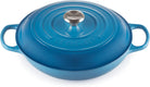 The Le Creuset enameled cast iron Braiser is uniquely designed to provide steady, even heat to transform tough cuts of meat and hearty vegetables into tender, flavorful dishes. The wide base allows ingredients to be placed in a single layer for searing without crowding; once liquid is added, the domed lid circulates steam to lock in moisture and flavor. The versatile shape of the braiser also makes it perfect for shallow frying, steaming, stews, casseroles and serving at the table.