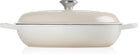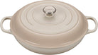 The Le Creuset enameled cast iron Braiser is uniquely designed to provide steady, even heat to transform tough cuts of meat and hearty vegetables into tender, flavorful dishes. The wide base allows ingredients to be placed in a single layer for searing without crowding; once liquid is added, the domed lid circulates steam to lock in moisture and flavor. The versatile shape of the braiser also makes it perfect for shallow frying, steaming, stews, casseroles and serving at the table.