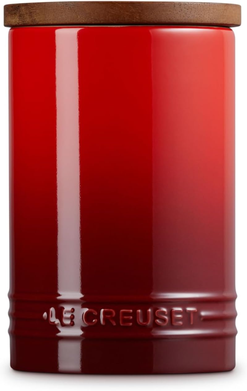 Available in four different sizes for maximum storage efficiency, these sleek, colorful Storage Canisters come with a tight-sealing acacia wood lid that allows for easy stacking on the counter or in cabinets. Air-tight silicone gaskets and a hard-wearing enamel finish make these canisters as functional as they are beautiful.