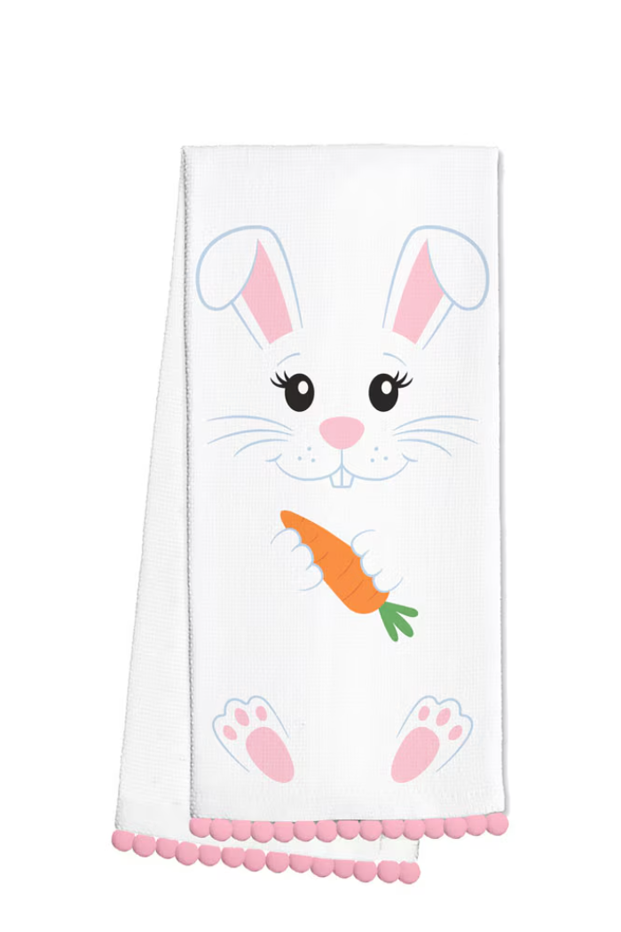 Give the perfect gift for any kitchen with this stylish tea towel! Hippity Hoppity here comes the Easter Bunny! This white bunny with pink accents, hops into the season holding a freshly picked carrot.
