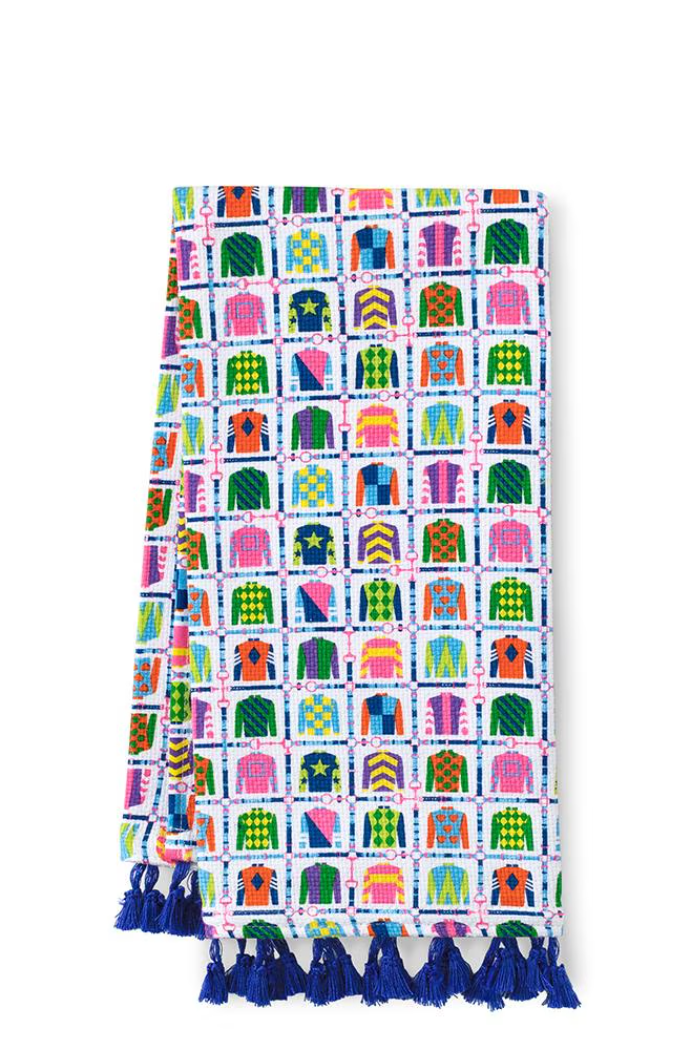 Give the perfect gift for any kitchen with this stylish tea towel! Place your bets, the jockeys are heading to the starting gate! Celebrate Derby Day with this bright and colorful pattern of jockey silks and bridles on a white background.