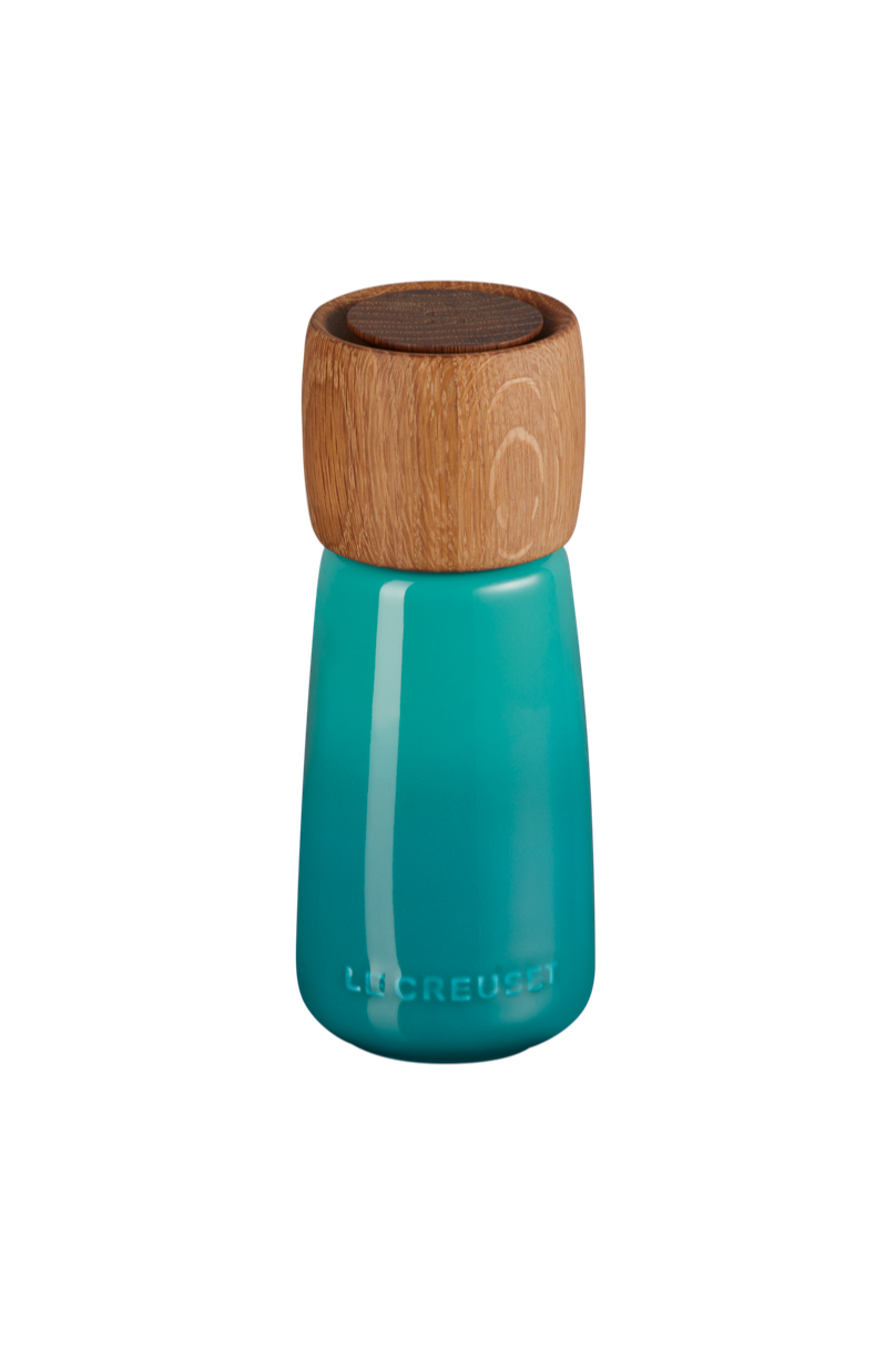 A compact Alpine Salt Mill in bright Bleu Riviera offers stylish table-side grinding for finishing salts. The mill pairs a glossy ceramic turquoise body with a natural wood top for a modern, coastal look. It operates as a countertop salt grinder and adds a pop of color to everyday cooking and entertaining. This piece is crafted with attention to detail and comes from Le Creuset, known for durable, design-forward kitchenware.
