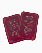 A compact set of burgundy instruction and play cards designed as a Mahjong shuffler accessory. The Burgundy Shuffler organizes deal counts and rules on durable, rounded rectangular cards for easy reference during games. This playful tabletop piece is styled in deep wine tones with gold and turquoise lettering for clear legibility. Oh My Mahjong designed the set to streamline play and add a decorative, game-night accent.