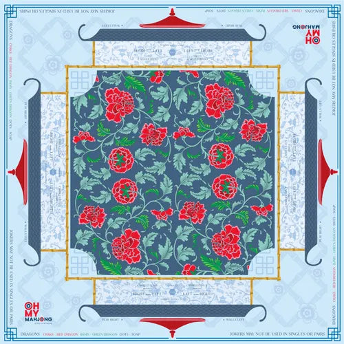 A decorative playing mat printed with Liberty-inspired florals and a chinoiserie border, sized for tabletop use. The LIBERTY Mat brings a bold navy field and scarlet peony motif to games or dining surfaces. OH MY MAHJONG designed this piece as a stylish protective layer that doubles as a graphic tabletop accent. Lightweight and easy to clean, it adds pattern and polish to any entertaining setup.