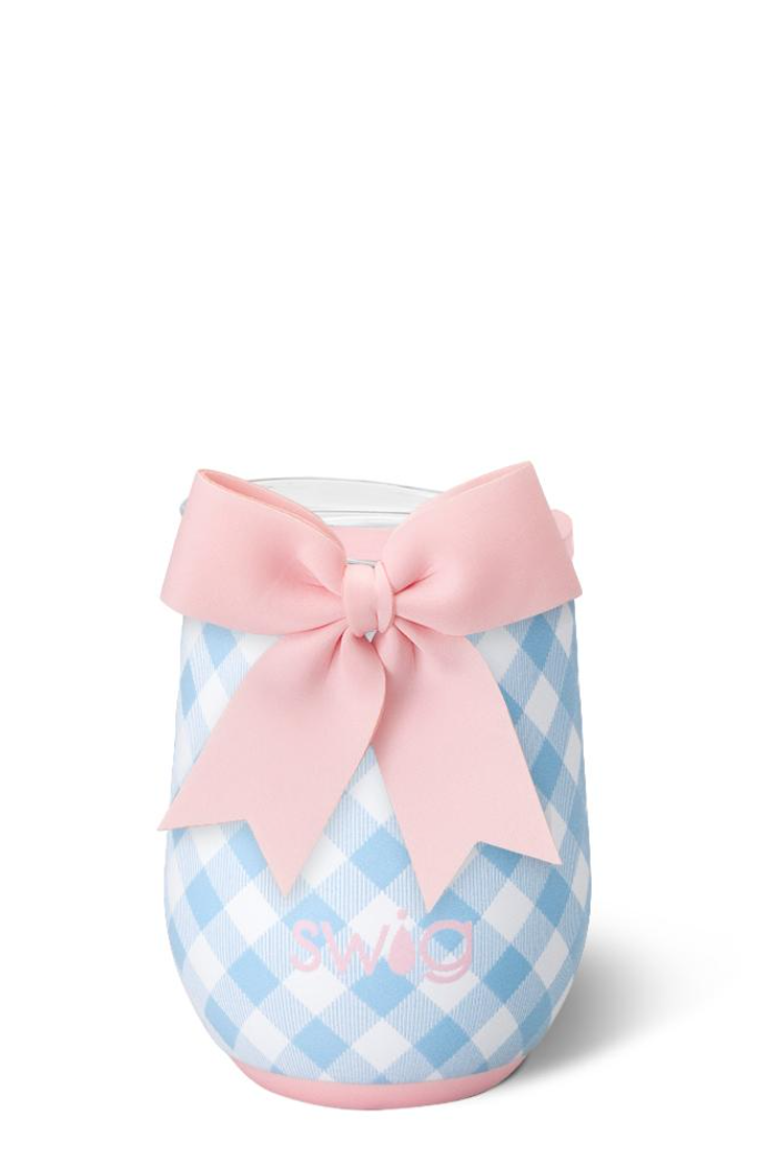 The Swig that started it all! This darling sky-blue gingham brings all the charm of a sunny picnic. A removable charming bow adorns each item like a gift.
