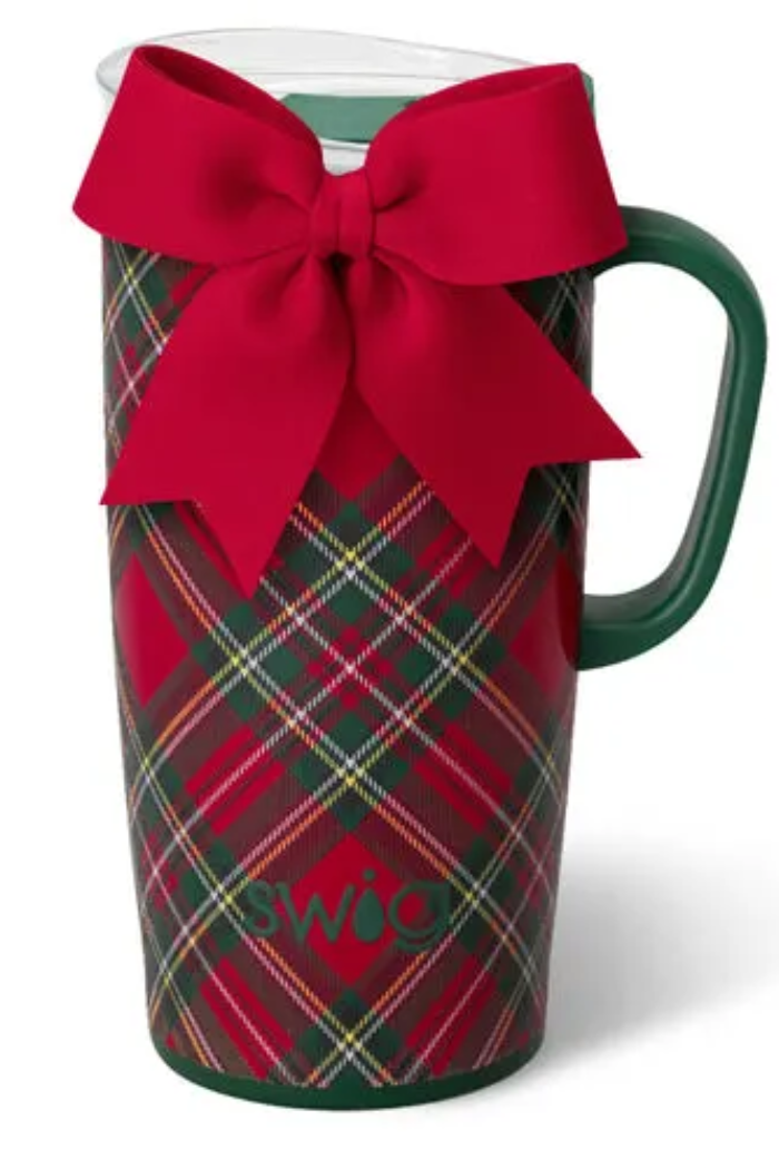 Take a "swig" of whatever fuels your day! βπ Celebrate the season in timeless style with this red and green traditional Christmas tartan design. A removable charming bow adorns each item like a gift.