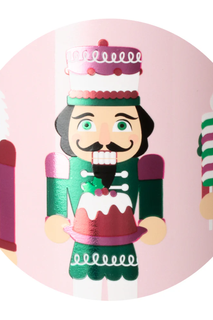 We've got it handled! ☕ Metallic toy soldiers dressed with peppermints and holiday candy march around a pale pink glitter background.