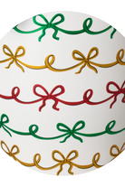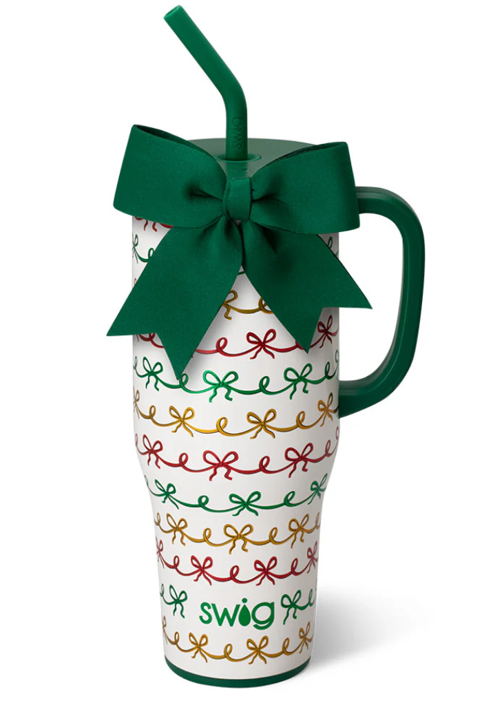 Mega sips, mega chill! 🧊 Get wrapped up in traditional holiday charm with red, green, and gold metallic bows on a glitter ivory background. A removable charming bow adorns each item like a gift. 🎀