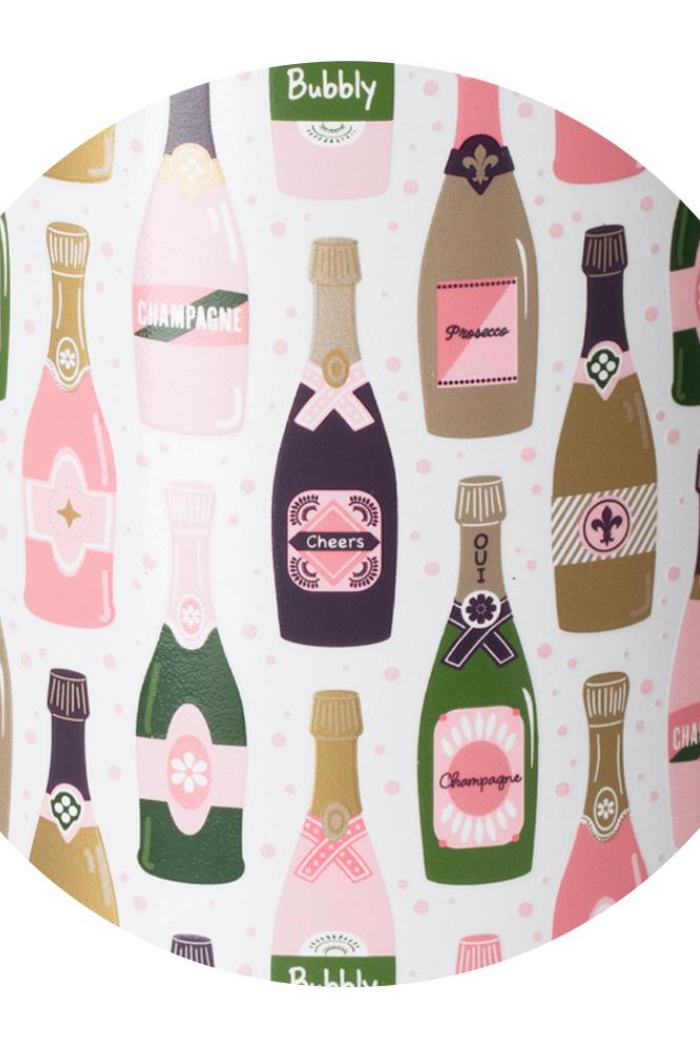 Mega sips, mega chill! Raise a glass to every sparkling occasion with this festive design of metallic gold prosecco and champagne bottles on a glitter white background.