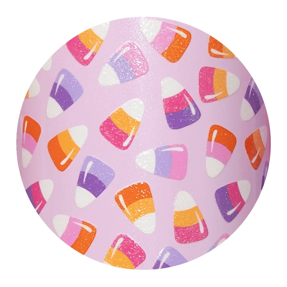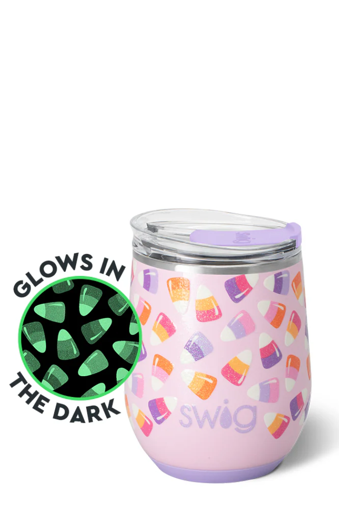 The Swig that started it all! ✨ Bite into something sweet this Halloween with this glitter glow in the dark candy corn on a glitter pink background.