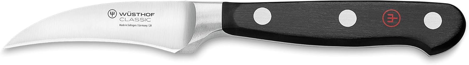 Particularly useful for peeling and cleaning rounded vegetables and fruit: this small, handy Peeling Knife - also known as a Turning or Tourne Knife - with its short, bird's beak-shaped curved blade, makes it easy to peel produce such as potatoes or apples quickly, preserving the valuable vitamins found directly under the skin. The plain edge of the Peeler / Tourne Knife enables very precise cuts, making it the ideal helper for hollowing out and decorating fruit and vegetables.