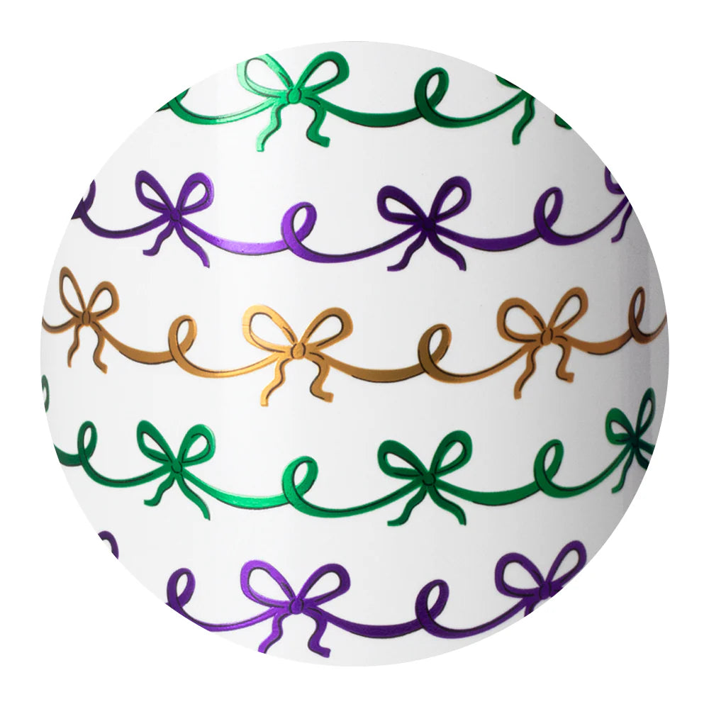 Bigger really is better! 💯Bring on the bows, beads, and bourbon with this Mardi-ready print, featuring purple, green, and gold metallic bows on a glitter white background.
